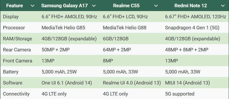 When reading the Samsung Galaxy A17 review, it helps to compare it to other phones that cost the same amount. Below is a quick comparison of the Realme C55 and the Redmi Note 12, which are both good options.